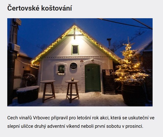 Cech vinařů Vrbovec pořádá čtvrtý ročník akce Čertovské koštování, které se uskuteční ve sklepní uličce první sobotu v prosinci.